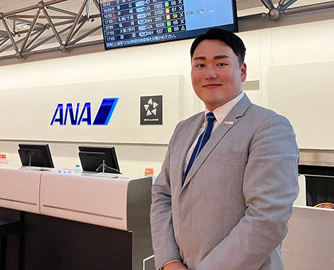 専門学校時代、実際の機内も再現したモックアップ教室で授業を受けたことで、実践力が身につきました。就職活動の面接対策では、一人ひとりに丁寧なアドバイスがあったおかげで、内定を獲得できたと思っています。現在は、東京国際空港(通称:羽田空港)でグランドスタッフをしております。国際線の「搭乗手続き業務」や、「ゲート業務」、「到着業務」を担当しており、学生時代の学びが役立っていると、日々感じています。