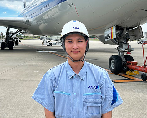 現在は主に航空機の「プッシュバック」「トーイング」作業に携わっており、出発機のお見送り(グッバイウェーブ)の際には毎回大きな達成感を得ています!