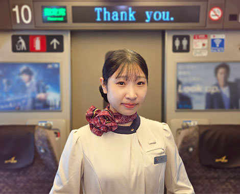 日本の大動脈である東海道新幹線を舞台に新幹線パーサーとして働いております。学生時代に学んだ言葉遣いや所作、お身体の不自由なお客様へのサポートなど、乗り物が違っても、全てが繋がっていると日々感じております。大阪航空専門学校ではエアライン業務の他にホスピタリティも学ぶことができるため、自信を持ってお客様を接遇することができています。お客様から「ありがとう」と言われた瞬間が一番のやりがいであり、人生に役立つ学びとなっています。